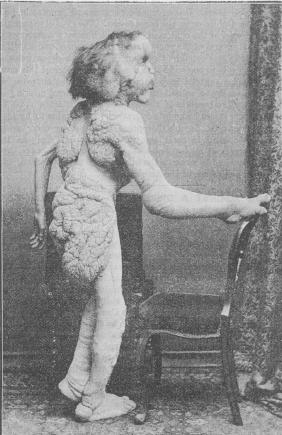 ... an enormous and deformed head, right arm and both legs very bent, emphasizing stretching and hypertrophy of the majority of the fingers of his right hand, scoliosis, and a pronounced limp in his left hip. Had numerous nodules and papillary masses, like a cauliflower, widely disseminated in the skin and soft tissue of the scalp, right side of the face, back, buttocks and limbs. Protruding upper jaw bone mass, creating a unique appearance as a proboscis, this mass had recurred after resection at the age of 20 years.